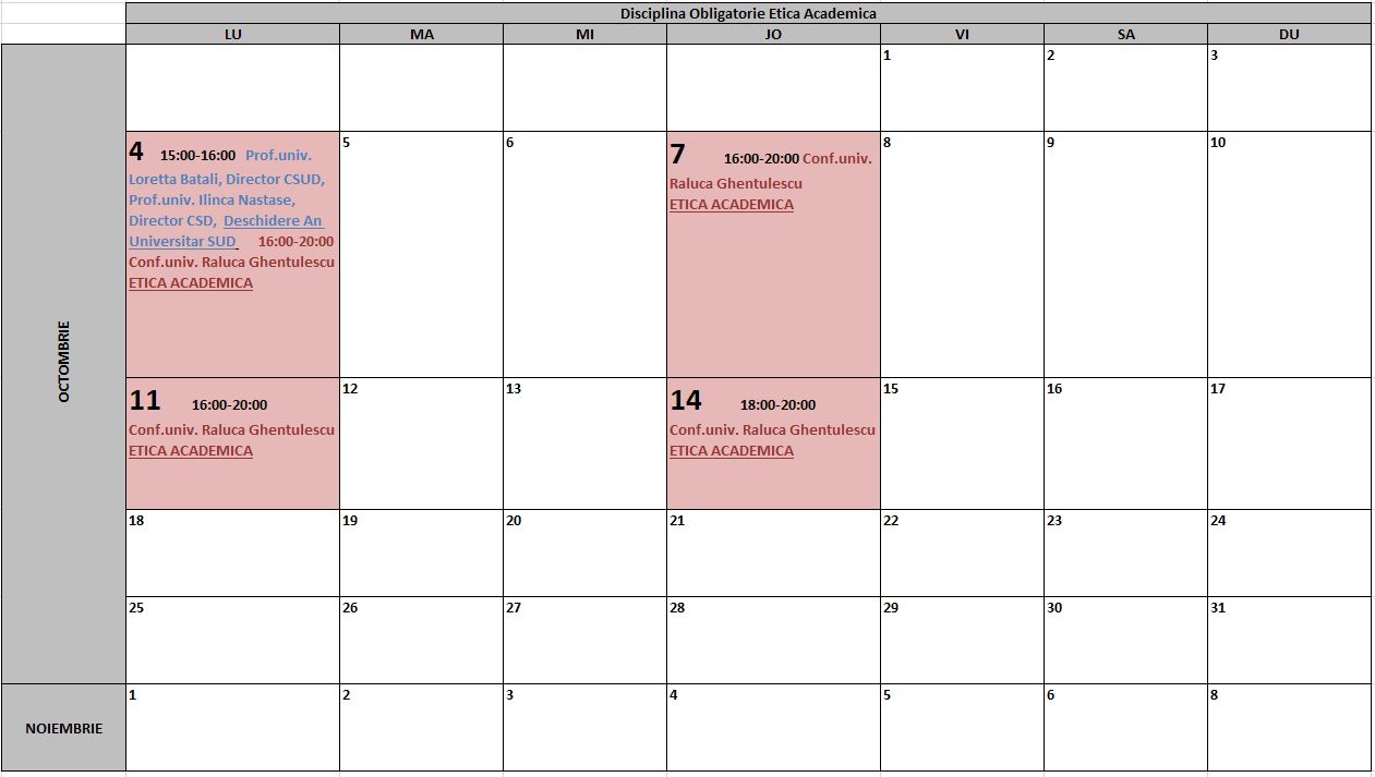 Am atasat orarul pentru Disciplina Etica Academica care va incepe de maine, de la ora 16:00, pe Teams, pe canalul DO ETICA ACADEMICA AICI !