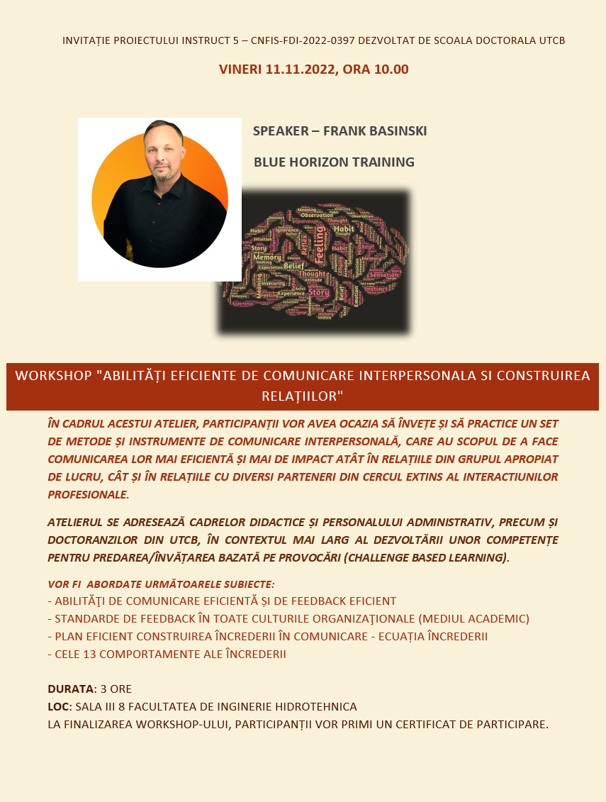 INVITATIE LA WORKSHOP “ABILITĂȚI EFICIENTE DE COMUNICARE INTERPERSONALA SI CONSTRUIREA RELAȚIILOR” UTCB \ Noutăți \ INVITATIE LA WORKSHOP „ABILITĂȚI EFICIENTE DE COMUNICARE INTERPERSONALA SI CONSTRUIREA RELAȚIILOR” 4 November 2022